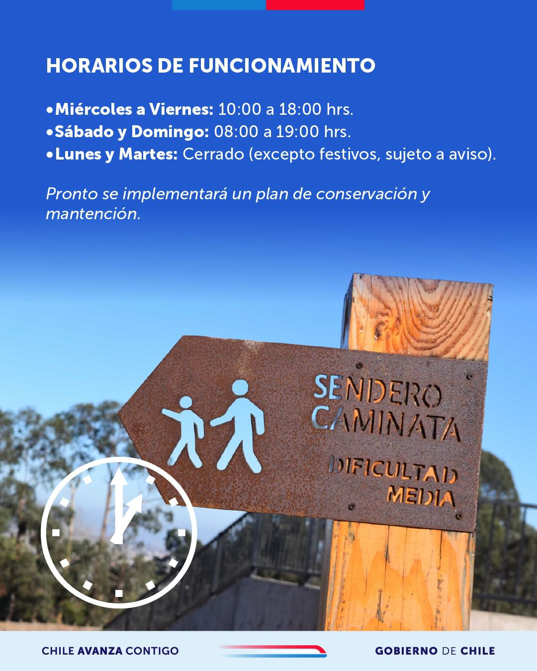 Su reciente apertura será, durante los primeros meses, en la modalidad de marcha blanca, con la finalidad de ir mejorando paulatinamente la experiencia de los usuarios. A partir de aquello, estará abierto al público de miércoles a viernes entre 10:00 y 18:00 horas, sábados y domingos de 08:00 a 19:00 horas. En tanto los lunes y martes, se mantendrá cerrado (excepto festivos, sujeto a aviso), para trabajos de mantenimiento.