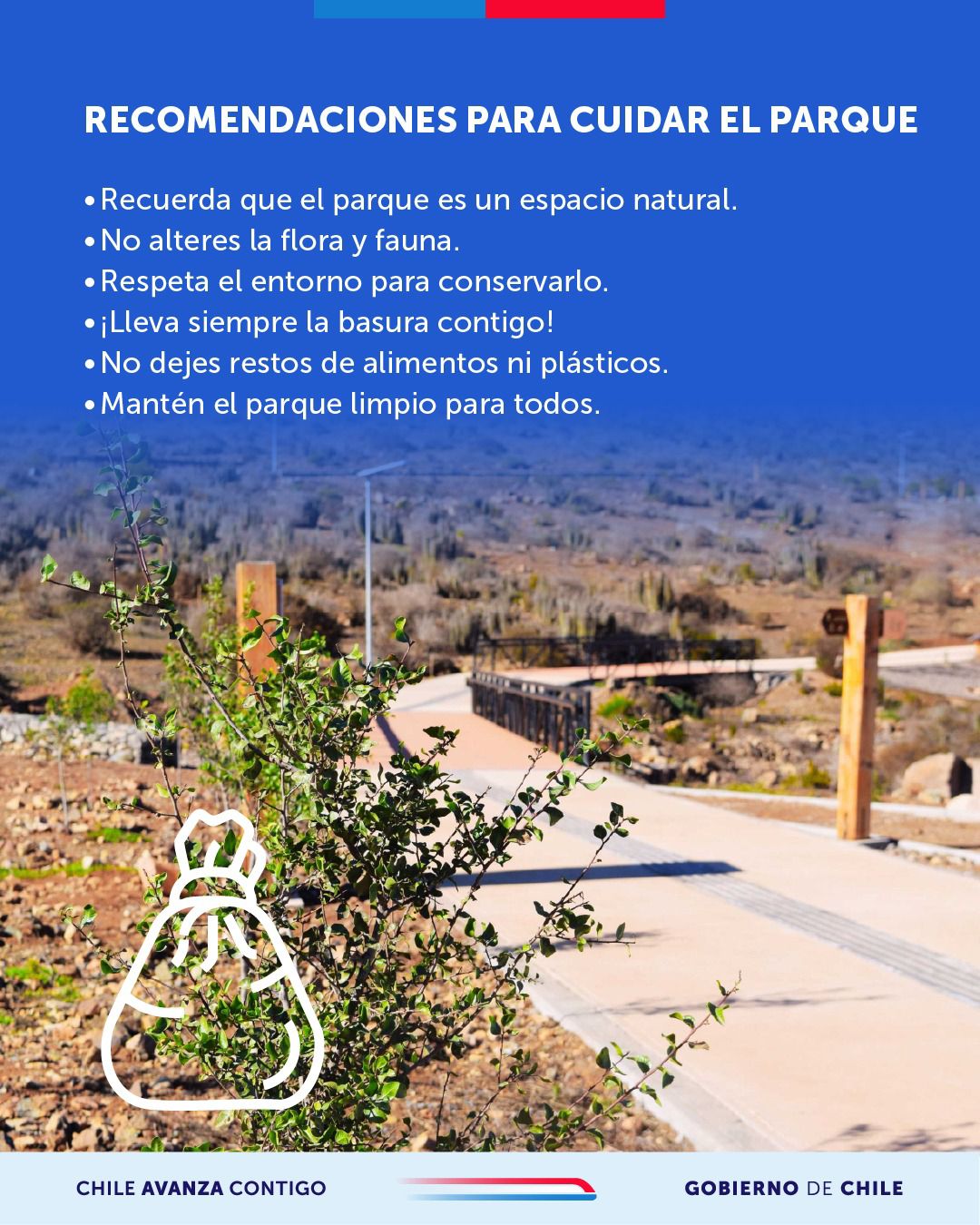 En tanto Ángelo Montaño, Director Regional de SERVIU, explicó que “es un parque que busca poner en valor el cuidado de la naturaleza a través de un buen manejo. Por un lado, hay servicios básicos y estacionamientos, pero también plaza de calistenia, muro de escalada, juegos infantiles, puntos de observación y áreas de actividad física. El cuidado depende mucho de las familias, el llamado es que sean responsables. La idea es que cada persona se lleve su basura, porque acá hay fauna, por ejemplo, zorros y aves”.